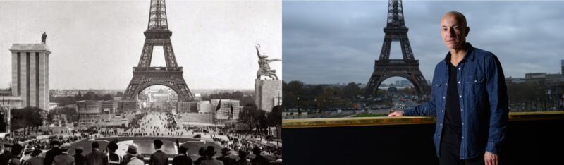 A gauche, vue du Trocadéro, depuis le palais de Chaillot, lors de l’exposition universelle de 1937. Image © paris-projet-vandalisme.blogspot.com. A droite, Rachid Ouramdane, dans le même lieu, plus de 80 ans plus tard. Image © Michaël Huard